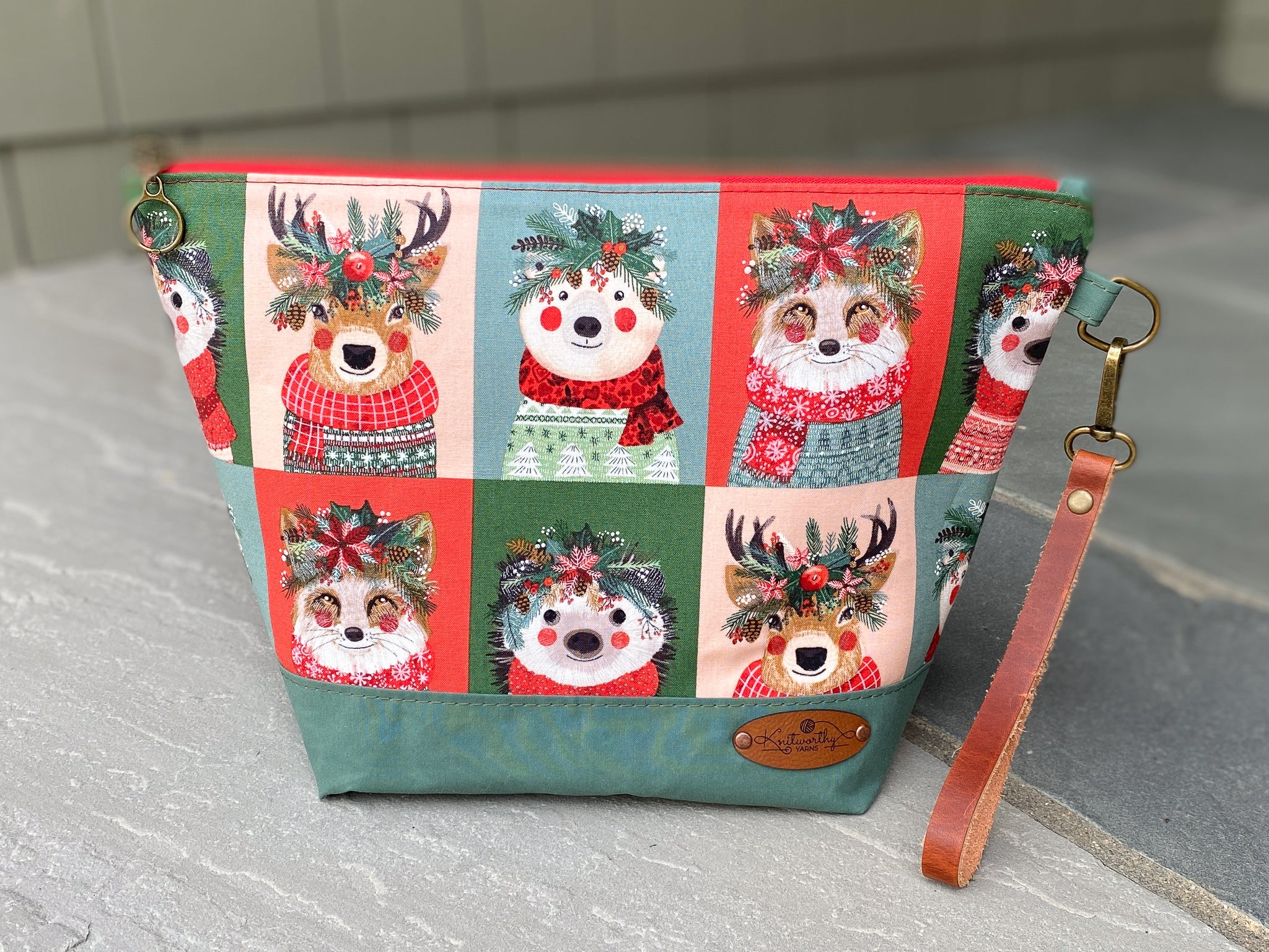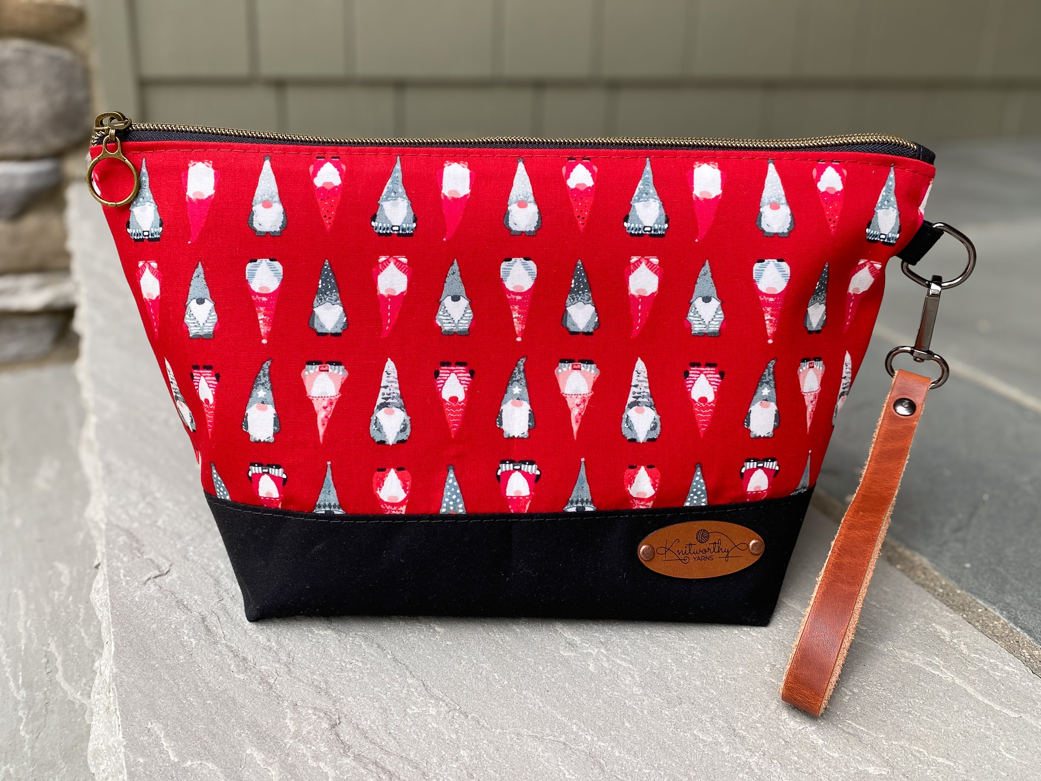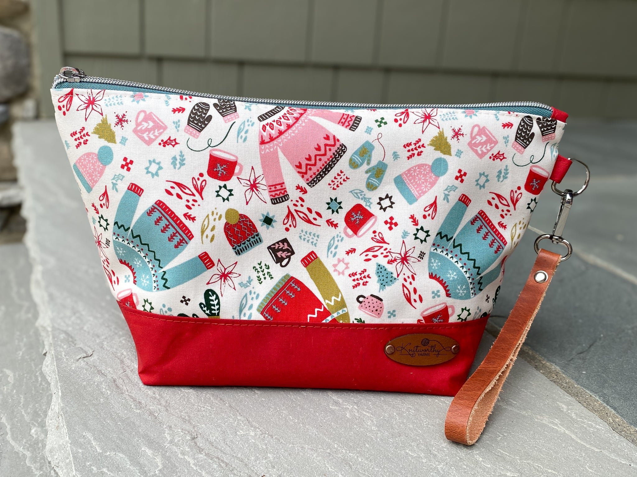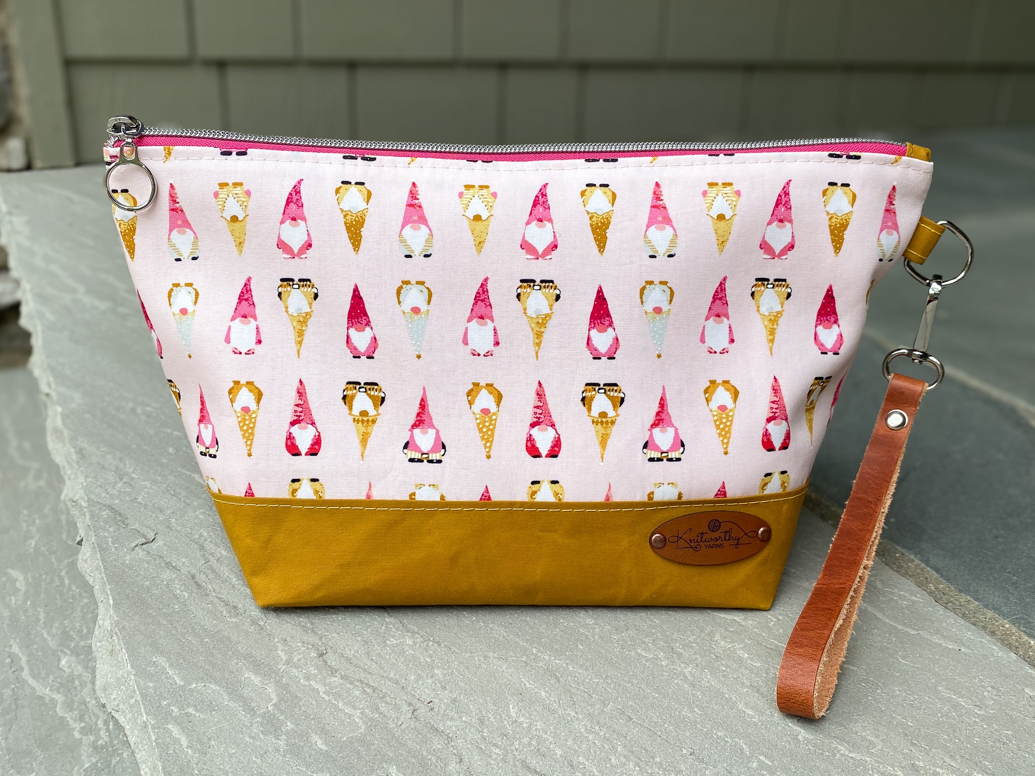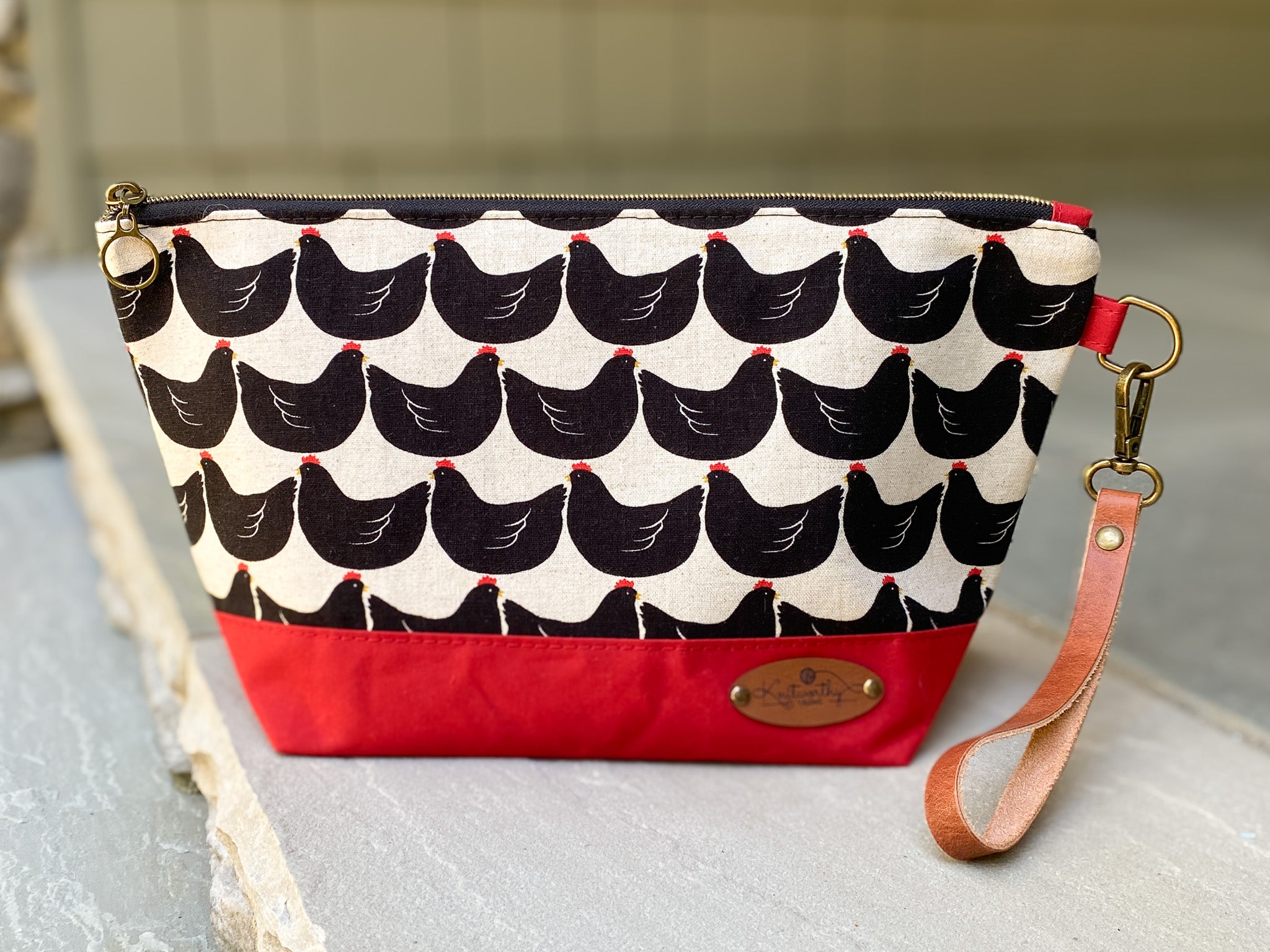 The zipper is open on one end which allows the bag to open up completely. Its extra large base fits larger projects. We used our favorite ring zipper pull on our snag free nylon zippers. Yup, we carefully selected each zipper, zipper pull, and hardware to coordinate with the fabrics!As an added bonus there is a leather wrist strap, so this really is a perfect Bag on the Go!